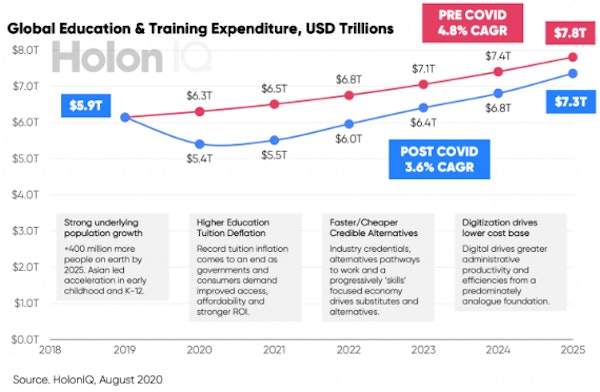 El tamaño del mercado global de educación y formación disminuirá debido a un menor costo administrativo. Los factores clave de este cambio en el mercado son la deflación de las matrículas educativas, combinado con alternativas en auge más baratas y rápidas, y la digitalización.