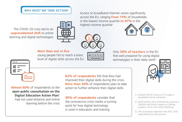 Este plan es una llamada de atención para movilizar una mejor cooperación entre los países europeos. Los dos objetivos principales son, por un lado, aprender de la crisis del coronavirus, donde la tecnología se está aplicando a un nivel nunca antes experimentado en la formación y la educación, y por otro lado, construir sistemas de educación y formación adecuados para la era digital.