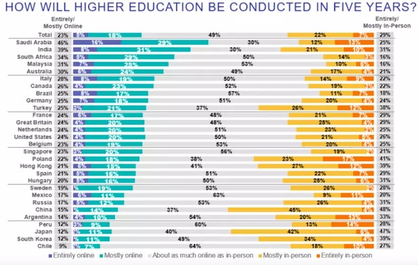 El aprendizaje en línea podría convertirse en un elemento común de la educación superior en los próximos cinco años, según una encuesta realizada por Ipsos para el Foro Económico Mundial. Para obtener los resultados, se preguntó a más de 27500 adultos de 29 países cómo creían que se llevaría a cabo la educación superior en su país, en los próximos cinco años.