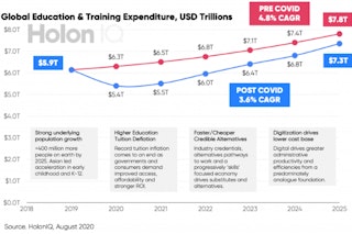 The overall Global Education and Training market size will decline because of a lower administrative cost. The key factors of this market shift are the deflation on education tuition, combined with cheaper/faster credible alternatives and digitization.